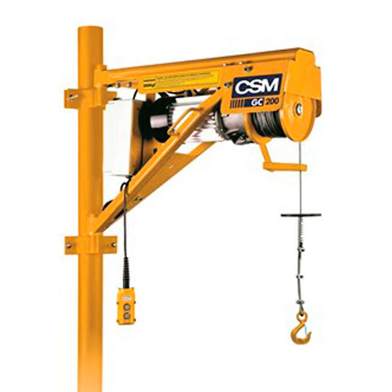 Guincho de coluna – capacidade de elevação 200Kg, motor trifásico, comando por botoeira. Acompanha caçamba de 80lts.